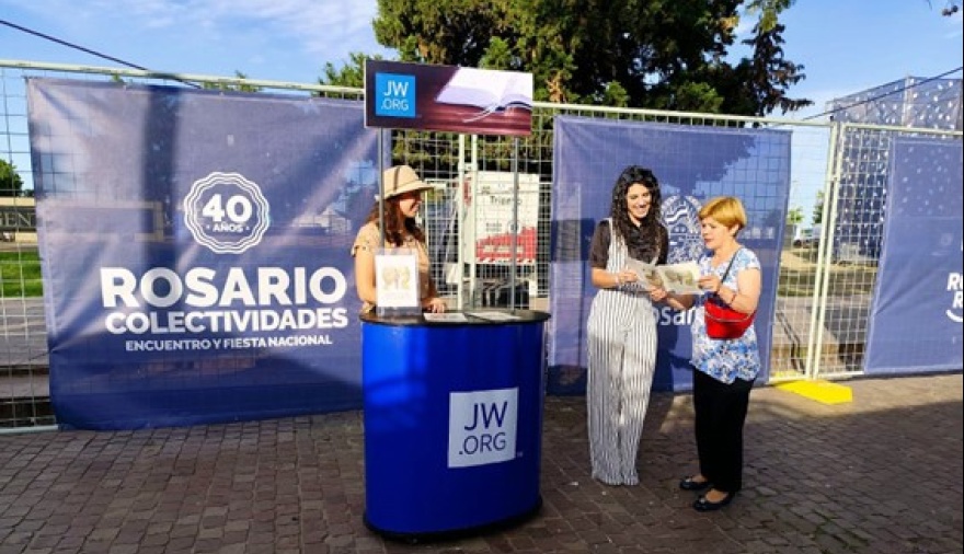 Cada año se lleva a cabo en Rosario el Encuentro y Fiesta Nacional de Colectividades. Como en años anteriores, los testigos de Jehová se hacen presentes con sus tradicionales exhibidores de publicaciones bíblicas en varios idiomas. Si pasa esta semana por el ingreso a la feria, podrá notar rostros sonrientes junto a expositores portátiles que ofrecen un mensaje positivo.