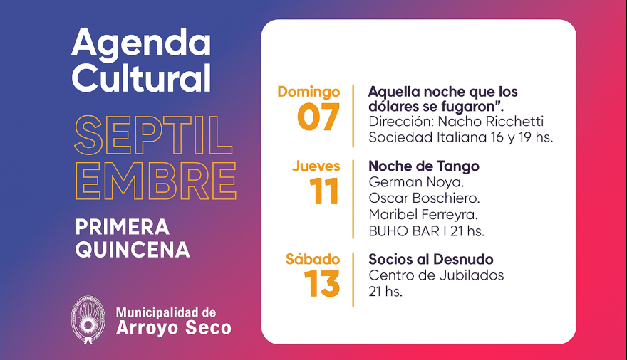 Pasando el domingo 7 de septiembre se desarrollará la FeriArte en la Plaza San Martín a partir de las 14 horas. En tanto el domingo 7 se volverá a proyectar Aquella noche que los dólares se fugaron en la Sociedad Italiana, en esta oportunidad con funciones a las 16 y las 19 horas.