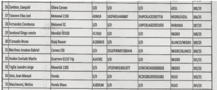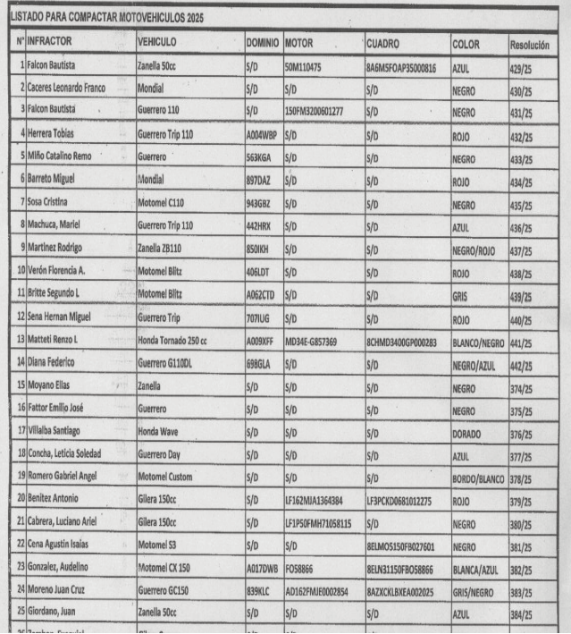 El listado difundido incluye 35 motocicletas de distintas marcas y modelos que fueron retenidas por diversas infracciones de tránsito y que, según la normativa vigente, se encuentran en condiciones de ser compactadas.