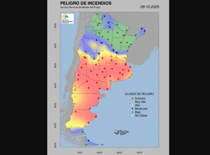 Desde el Servicio Nacional de Manejo del Fuego indican que para este lunes 29 de diciembre hay riesgo extremo de incendios en 10 provincias del país: Buenos Aires, La Pampa, Córdoba, Mendoza, San Luis, Santa Fe, Neuquén, Río Negro, Chubut y Santa Cruz.