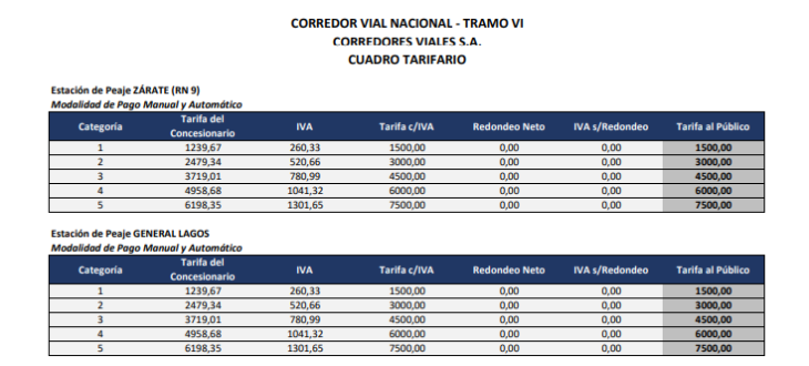 De acuerdo al decreto, a partir del aumento, las tarifas para todas las categorías de vehículos quedarían de la siguiente manera: