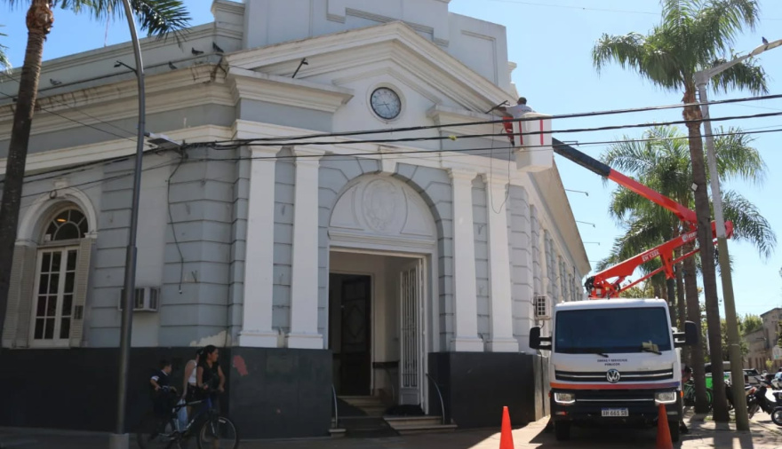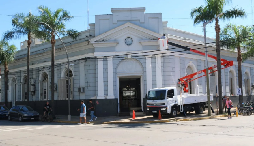 Según explicaron desde el área, el trabajo consta del reemplazo del viejo sistema de iluminación, que funcionaba desde hace muchísimos años de forma insegura e irregular sobre las palmeras que rodean el edificio sobre las veredas.
