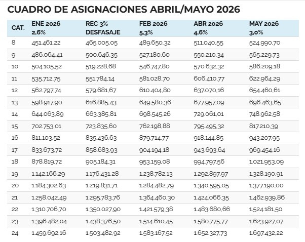 En esa oportunidad, según describen las actas paritarias, las partes acordaron fijar un incremento salarial para el primer semestre 2026 del 15,50% contemplando el 2,6% ya abonado en el mes de enero del corriente año. El saldo restante del 12,90% se abonará de la siguiente forma: